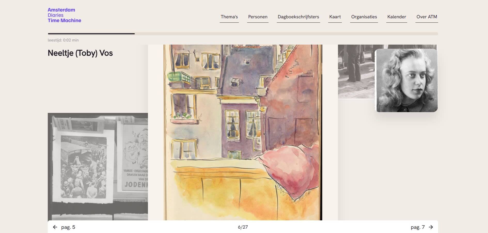 Hoe zag het dagelijks leven in Amsterdam eruit in de Tweede Wereldoorlog? En hoe beleefden Amsterdammers hun stad? Amsterdam Diaries Time Machine, een van de projecten van de Amsterdam Time Machine, brengt het verleden tot leven met dagboekfragmenten van Amsterdamse vrouwen tijdens WOII. Navigeer door hun dagboeken en lees over hun familie en vrienden, plaatsen en gebouwen in de stad.