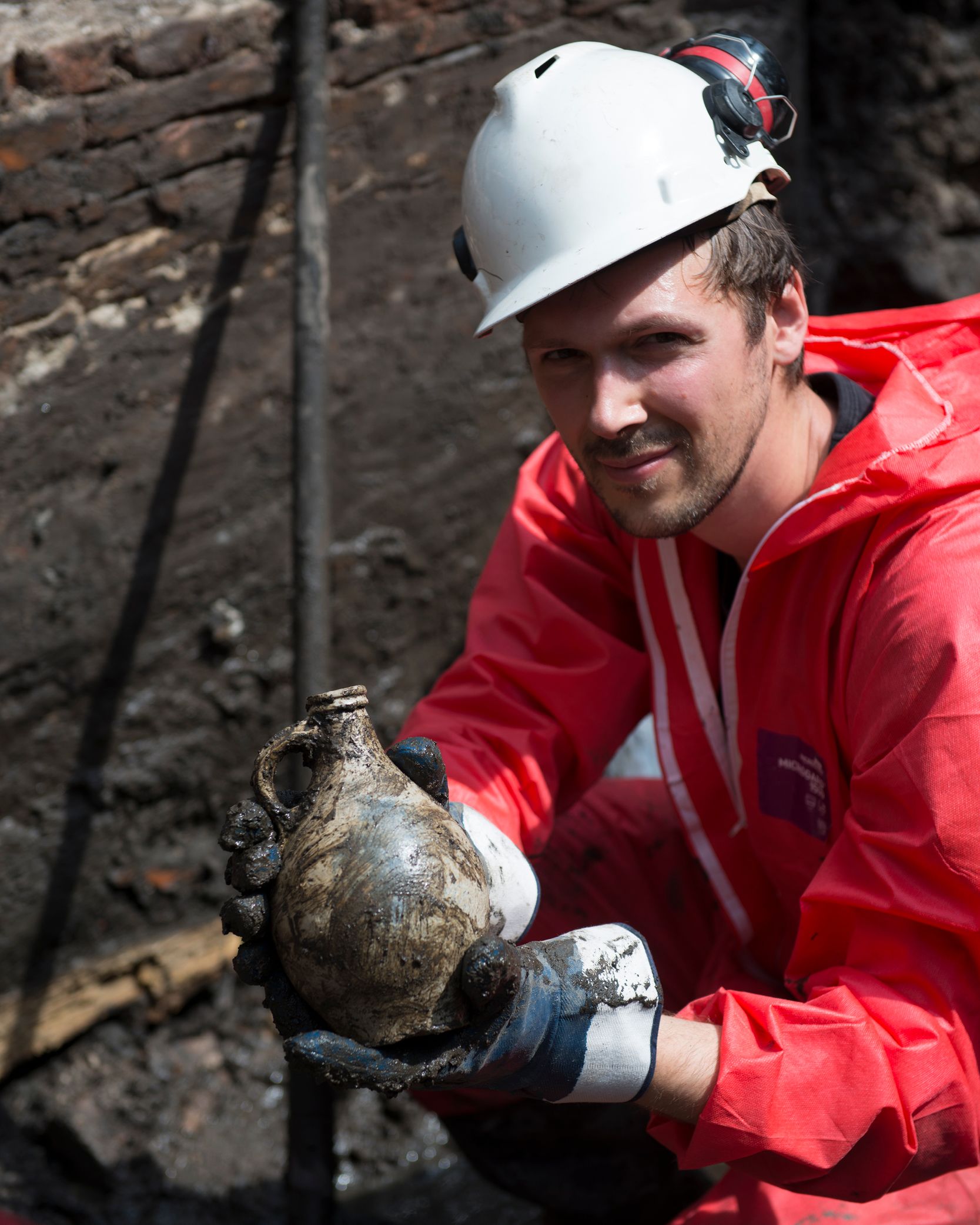 This 3D model shows the different phases of building activity on the site. Visible are the floors of the late 16th-century Pesthuis (Plague House), foundations of the 18th-century Verbandhuis (Infirmary), human burials, sewers, a cesspit, and a wash area.