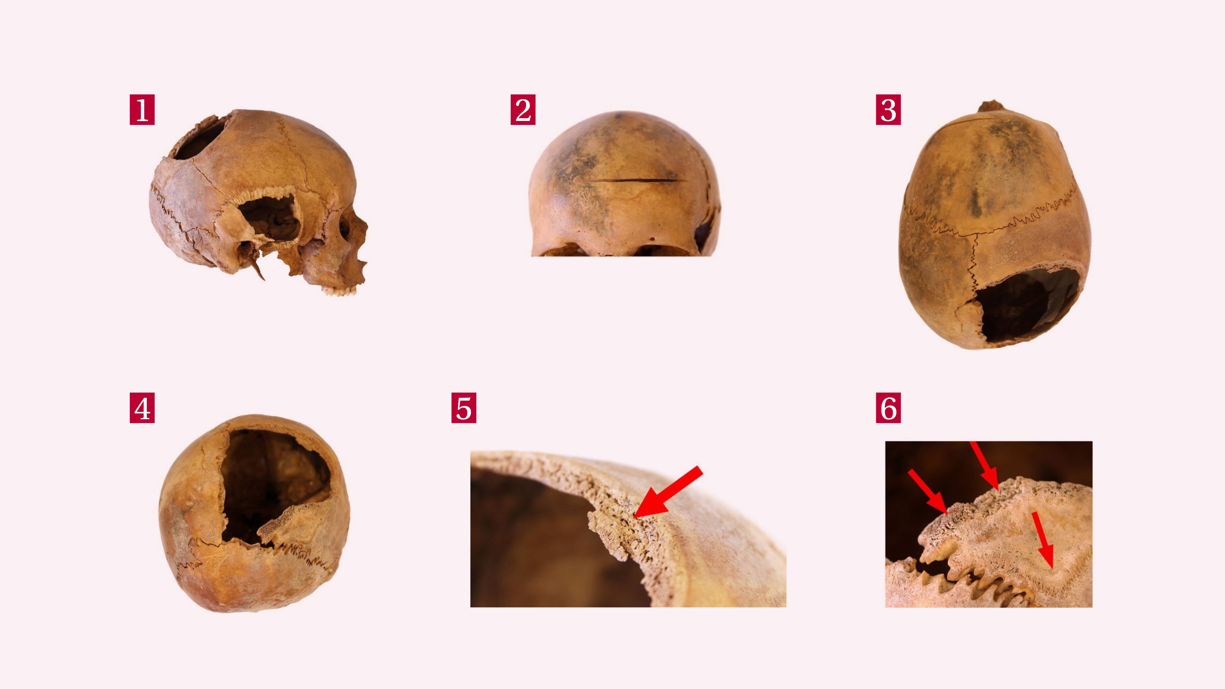 Skull with wound on the right side (1), saw cut on the forehead (2), top view (3), rear view (4), bone reaction along the edge of the wound and in the surrounding area (5 and 6)
