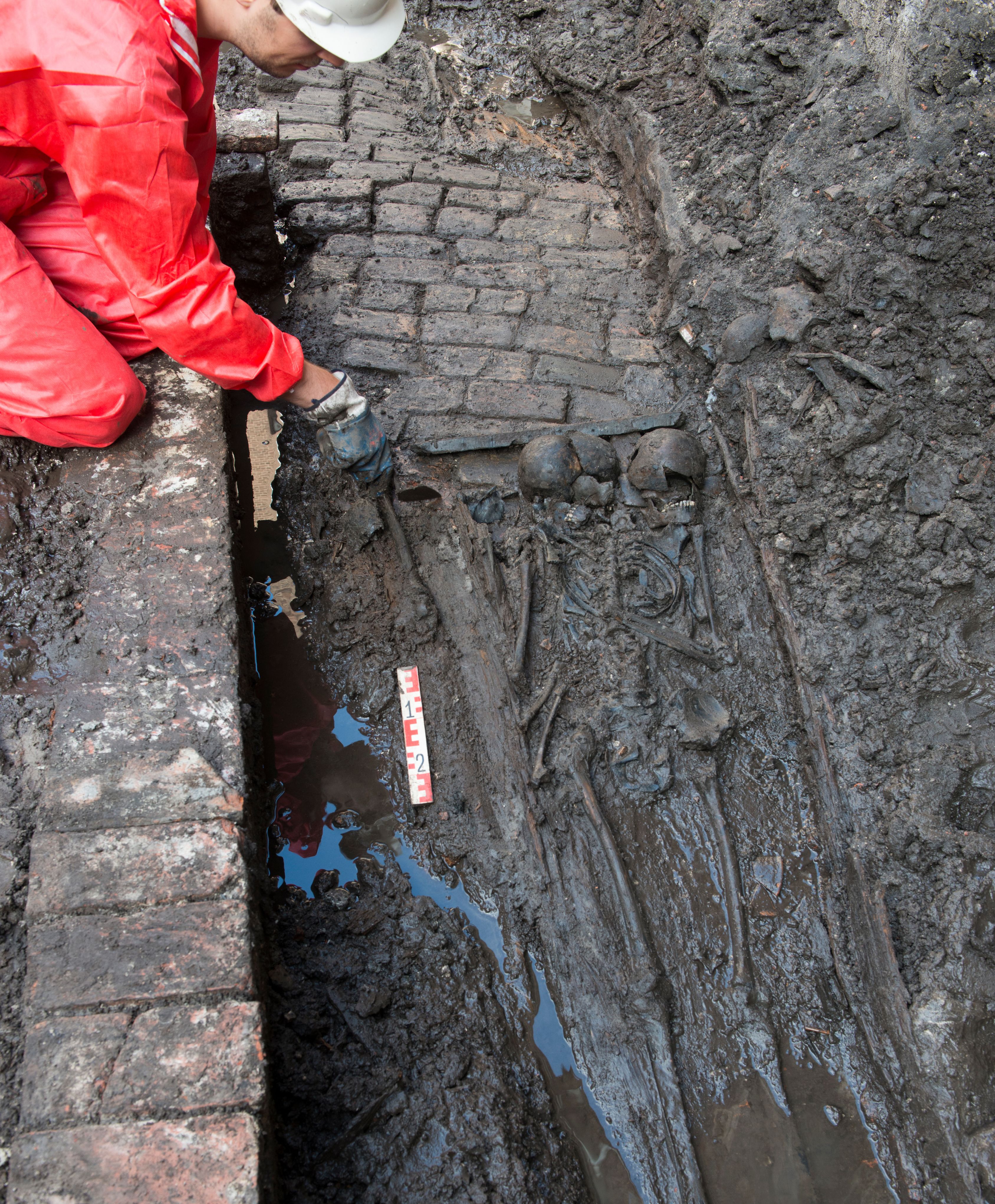 Archaeological research revealed that this Pesthuis also had a burial ground. Around 1600, an estimated 700 people were buried there. Eighteen individuals located within the construction site of the new University Library were excavated and examined by the Amsterdam Centre for Ancient Studies and Archaeology (ACASA) at the University of Amsterdam. These included 13 adults and five children, the youngest around 10 years old.