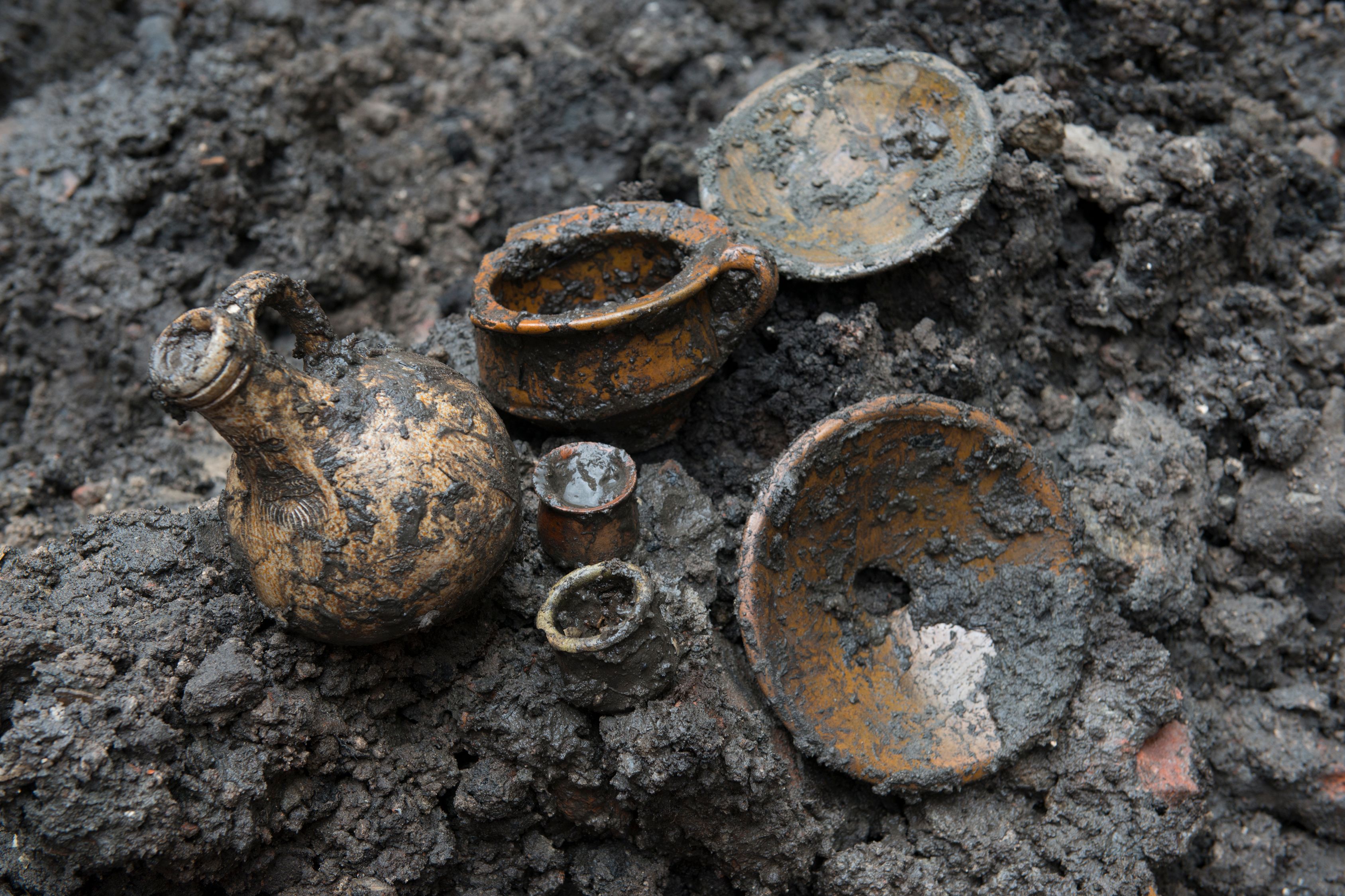 Het archeologisch onderzoek maakte inzichtelijk welke verbouwingen het complex in deze periode onderging. Uit de vroeg 17e-eeuwse fase resteerde ook een beerput, gelegen onder het voormalige ‘secreet’ van het verbandhuis. Tussen het afval lagen nog tal van zalfpotten, ondersteken, maar ook kook- en schenkgerei en olielampen voor de verlichting. De voorwerpen geven een bijzonder inkijkje in de dagelijkse gang van zaken in een 17e-eeuws ziekenhuis.