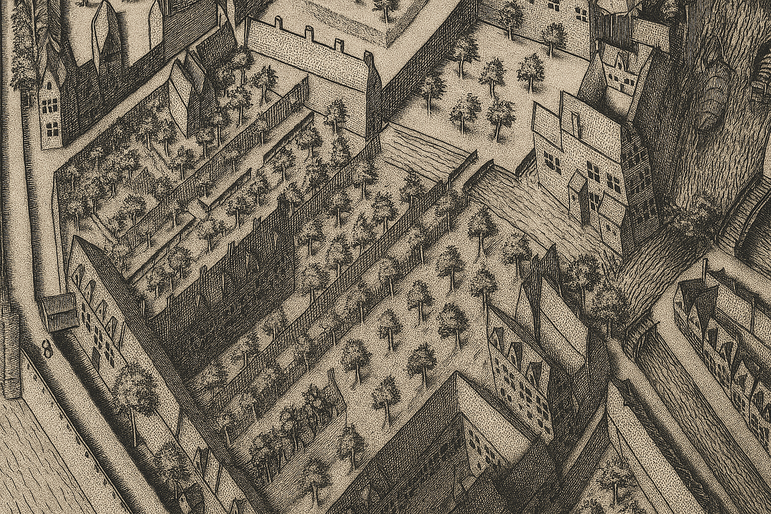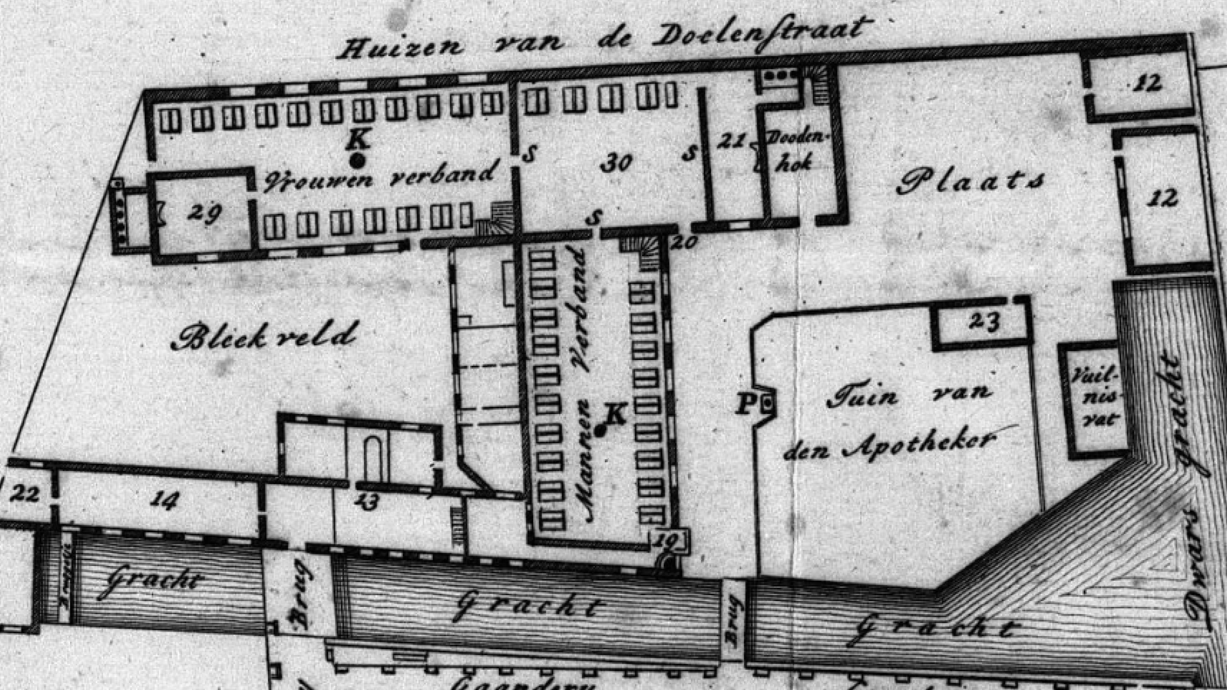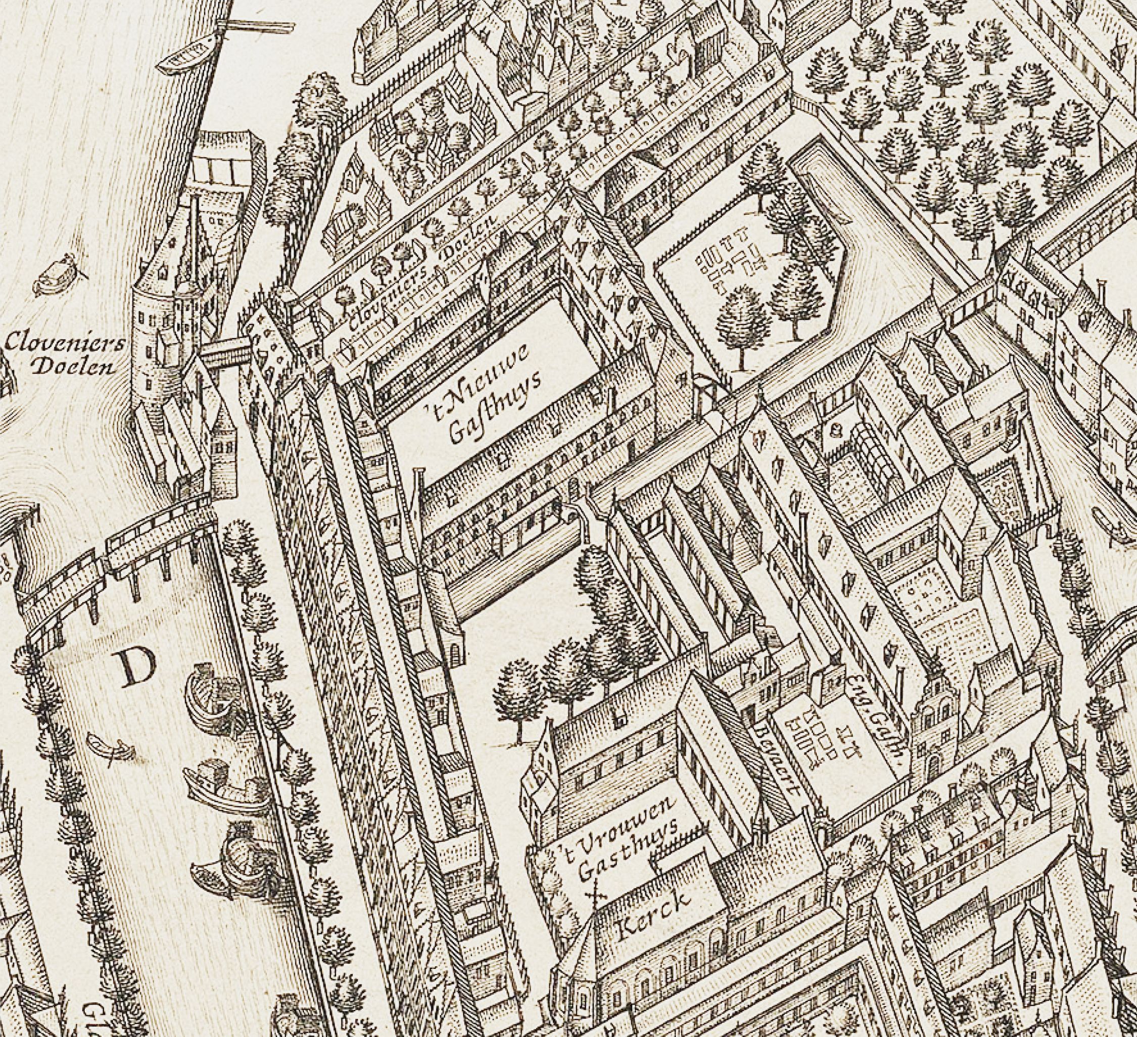 ‘Ten lesten wort het Pesthuys door een riviere daer tusschen loopende van de reste van het Gasthuys met een houten brugghe afghescheyden; alsoo nochtans dat het in het selve parck met het Gasthuys begrepen wordt; het heeft in het midden een viercante plaetse properlick gheschickt. Daer zijn rontom seer vele bedden. De voorleden jaeren de peste seer regnerende zijnder wel vijfhondert ende meer in het selve gheherberght t ‘samen gheweest.’