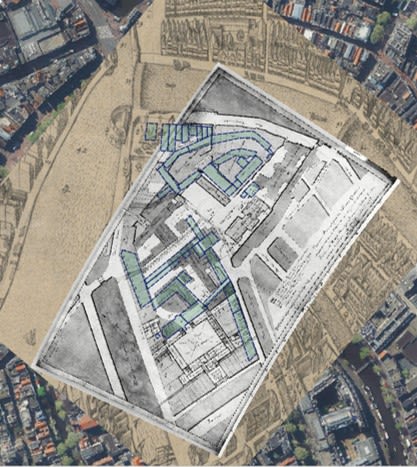De nieuwe UB (rood omlijnd) geprojecteerd op een kaart van het Binnengasthuis uit 1628 (Stadsarchief Amsterdam / Monumenten en Archeologie, Gemeente Amsterdam).