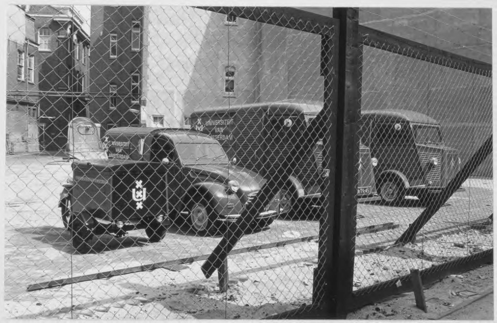 Around 1960, the University of Amsterdam acquired the by-then neglected hotel, which was demolished in 1967. From 1967 until 2019, the site served as a parking lot. This photo shows the UvA’s vehicle fleet from 1968.